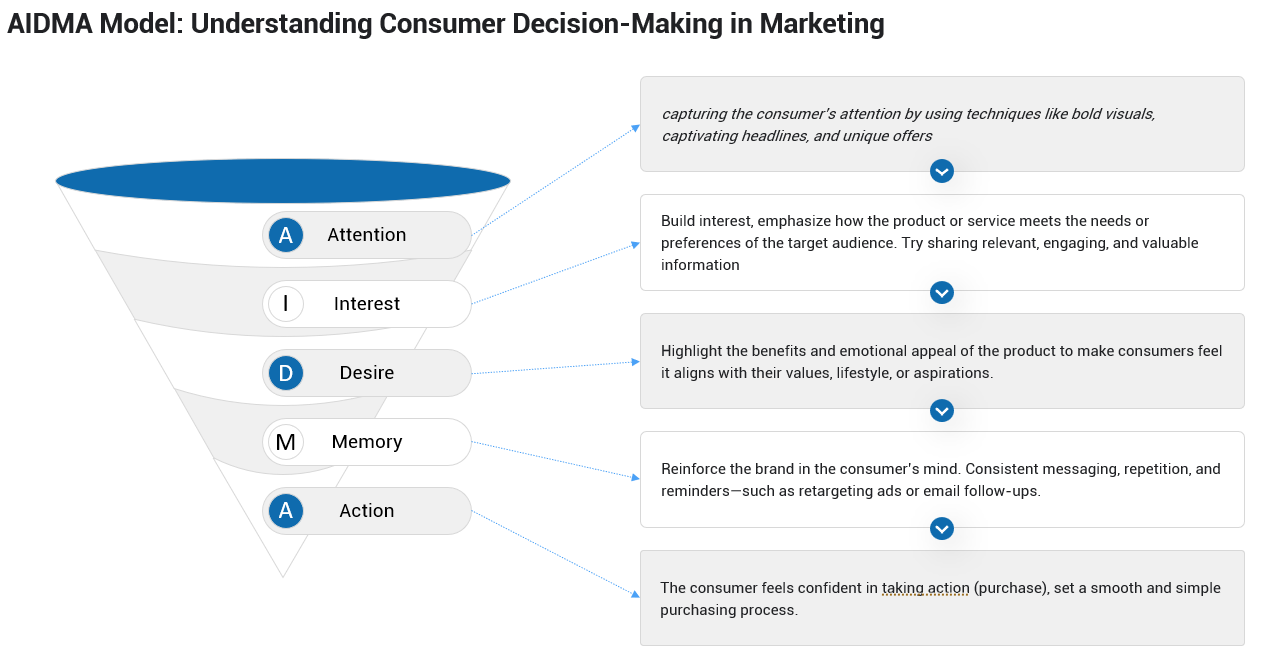 The AIDMA model is a powerful framework in marketing, helping business understand and influence each stage of the consumer journey, from initial awareness to final purchase.