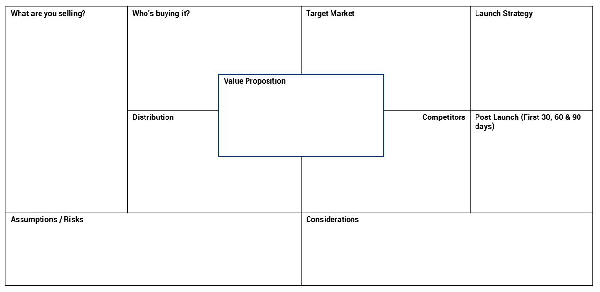 Each block asks simple but powerful questions to help you think through all the critical elements of a successful launch.